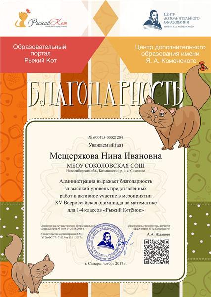 | Благодарность за высокий уровень представленных работ в 15 Всероссийской олимпиаде по математике для 1-4 классов "Рыжий котенок", 11.2017г. |  |