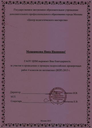 | Благодарность за участие в проведении и проверке всероссийских проверочных работ 4 классов по математике. 2016г. |  |