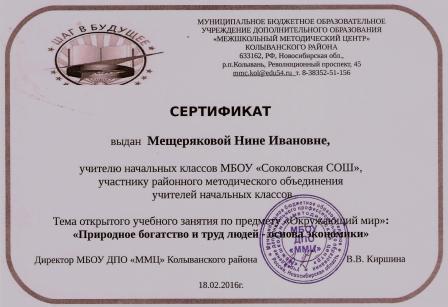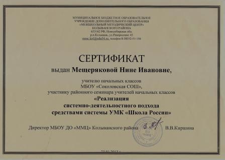 | Сертификат участника районного семинара учителей начальных классов "Реализация системно-деятельностного подхода средствами системы УМК "Школа России" |  |