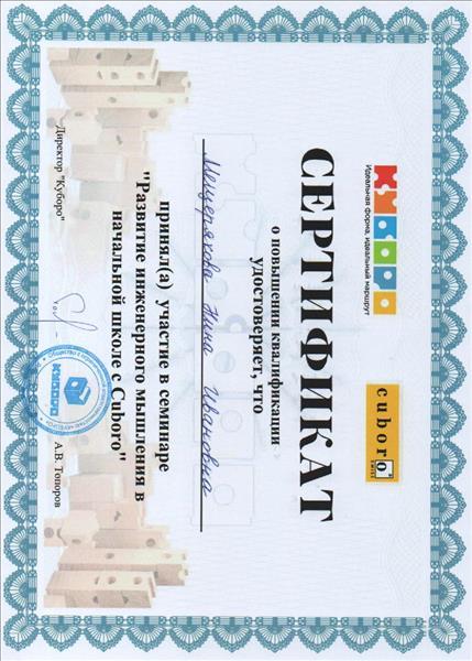 | Сертификат участника семинара "Развитие инженерного мышления в начальной школе с Cuboro", 2017г. |  |