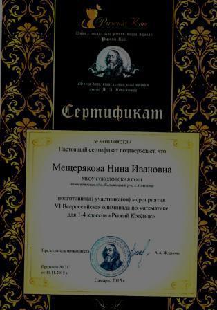 | Сертификат, подтверждающий подготовку победителей в 6 Всероссийской олимпиаде по математике для 1-4 классов "Рыжий Котенок" |  |
